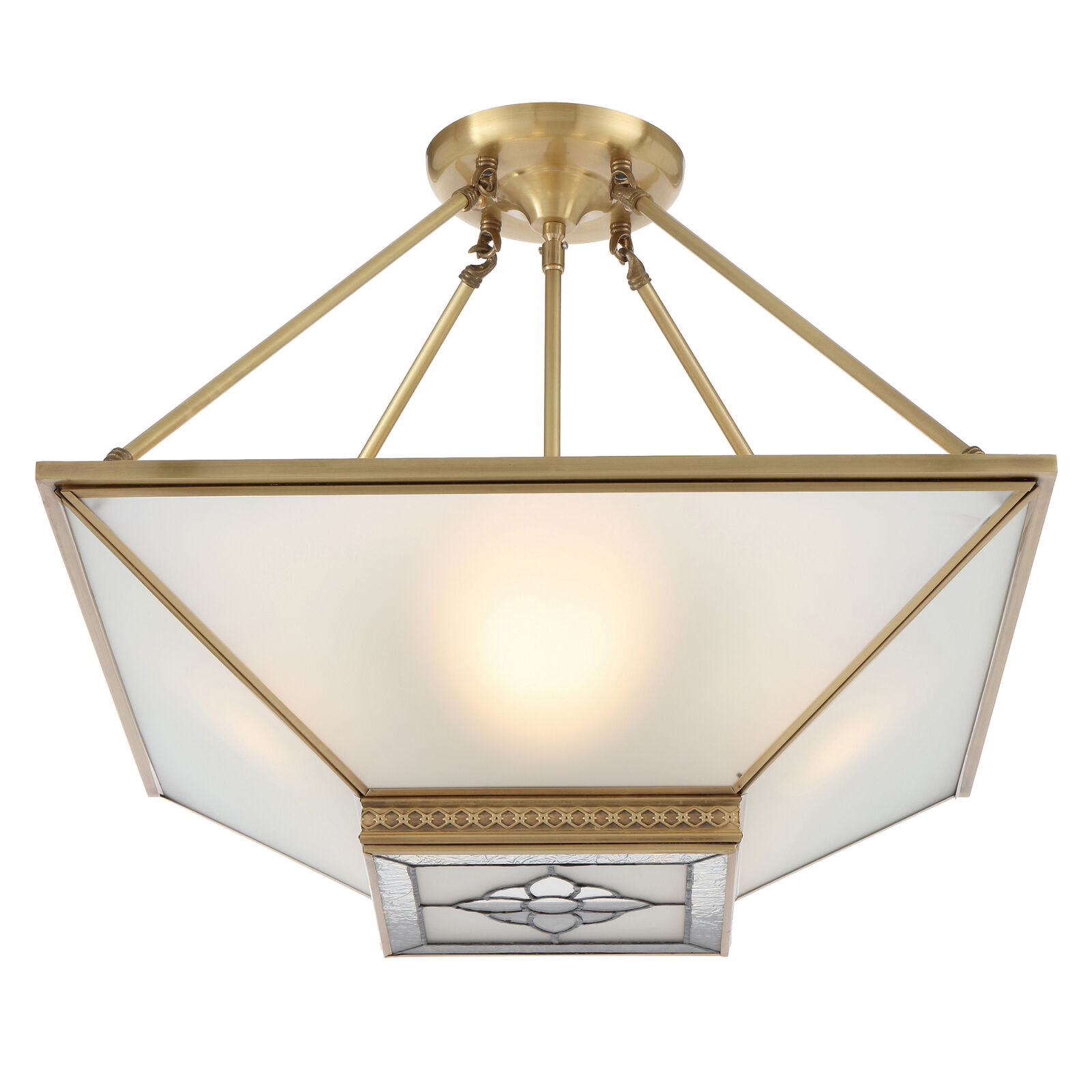 The Bracci Artisan Brass Pendant Light – a captivating blend of artistry and craftsmanship. Handcrafted with a solid brass frame, it radiates timeless elegance. The artisan leaded glass feature panel diffuses warm, colorful light, making each piece a unique work of art. Versatile and mountable close to the ceiling, it's perfect for various spaces. Illuminate your home with the Bracci Pendant's enchanting charm.