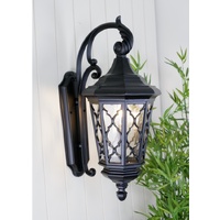The Brinley exterior wall lamp offers handsome Mediterranean styling. Featuring a boldly scrolled cast arm and caged lacework glass panels. This outdoor wall light features a flat black painted finish and clear seedy glass. Constructed from cast aluminium and available in 2 sizes.