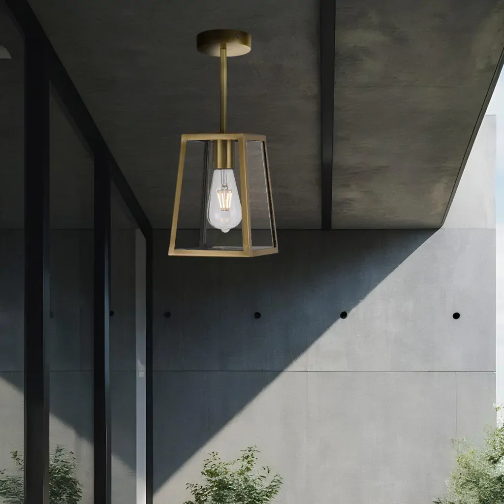 Cantena is a bold yet simple vintage outdoor pendant lamp. The tapered frame holds trapezoid clear glass and is suspended by a short rod with chain. The Cantena family is crafted in solid brass and finished in polished brass or brass painted in black. Available in 2 sizes, also as a wall lamp.