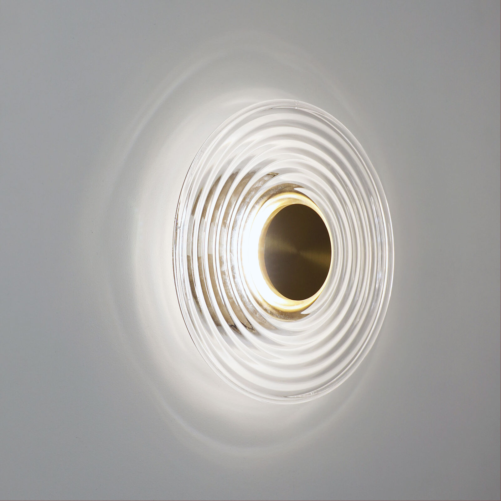 The CINCIN tri-colour LED wall light with satin brass metalware. Inspired by the ripple effect of a water droplet this fitting features a beautiful backlit clear glass disk which casts a soft shadow around the wall. Looks great as a feature above open shelves in a kitchen or as a hallway feature light. This fitting features colour temperature switching technology, meaning, the installing electrician can select the preferred colour temperature at time of installation.