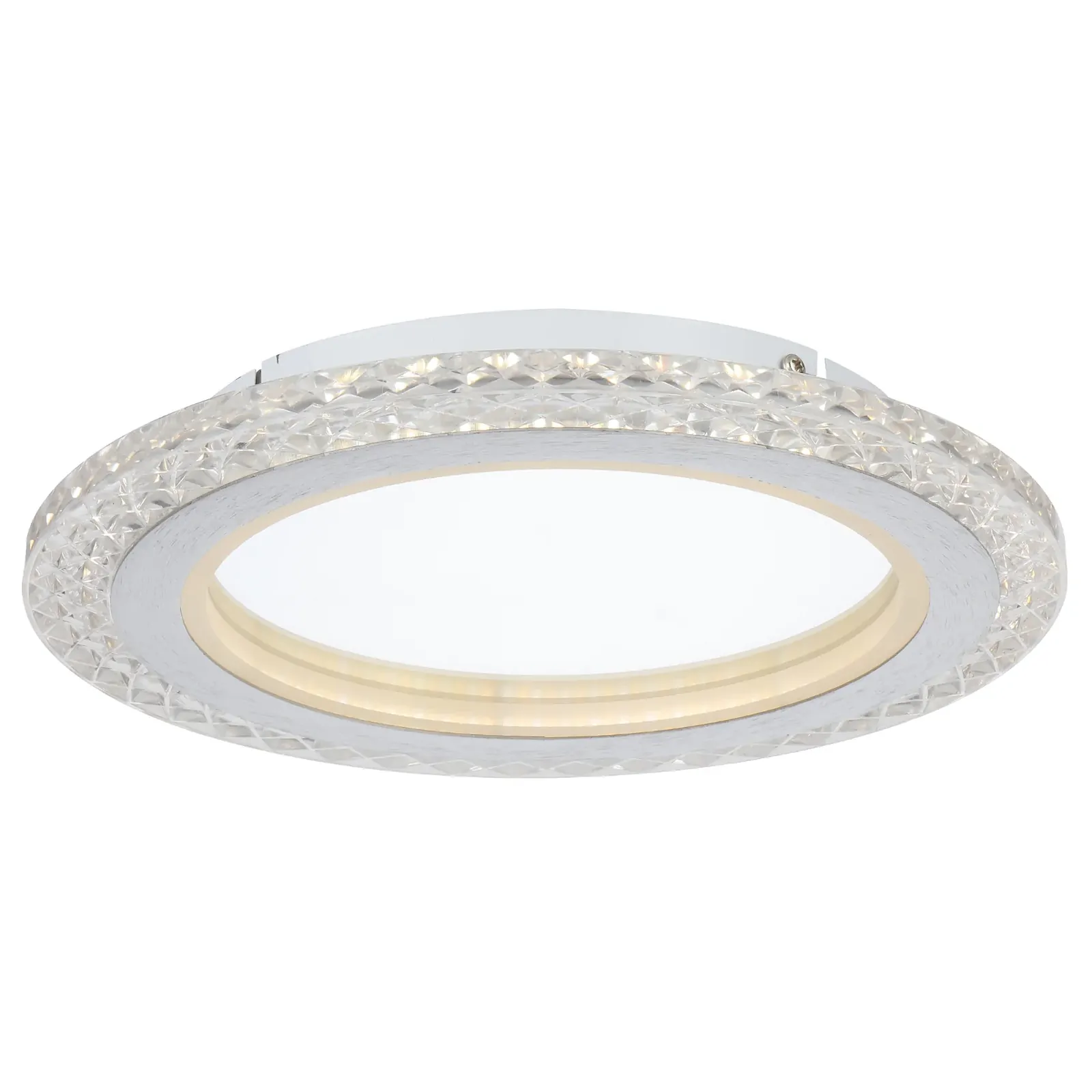The unique facetted clear outer frame creates an alluring play of light, while the mirrored center enhances illumination throughout the room.
