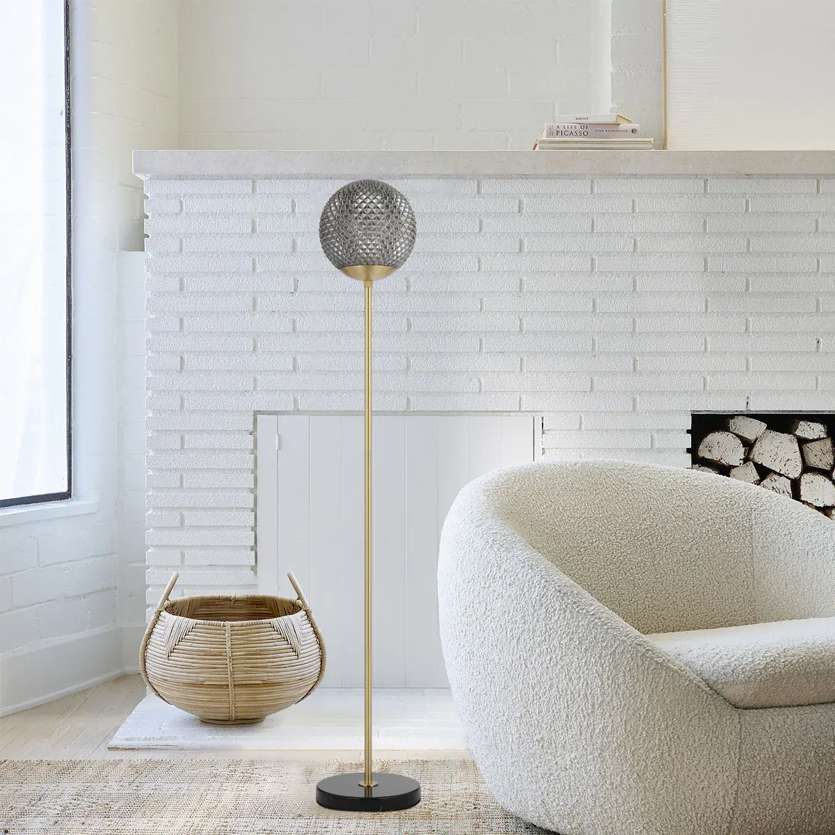 Anchored by a luxurious marble base, its antique brass body ascends to cradle a mesmerizing mouth-blown faceted glass shade.