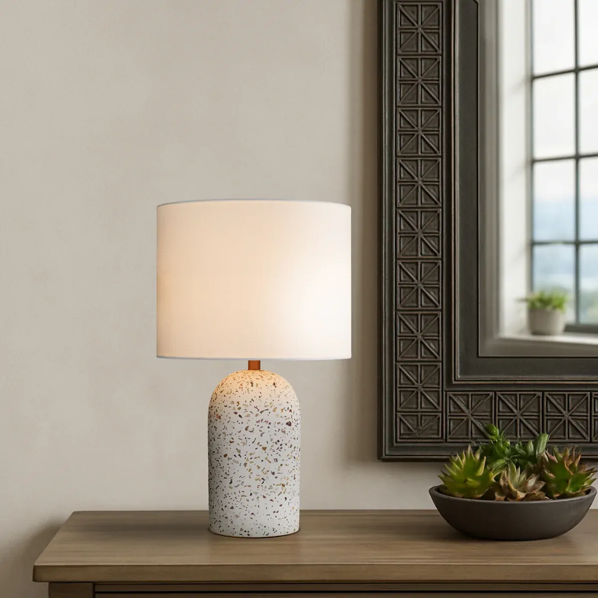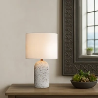 The FEVIK table lamp is a modern and on-trend lighting option for any room in your home. This lamp is available with a terrazzo or concrete base, adding a touch of industrial and minimalistic style to the design. The matching fabric shade provides a warm, diffused light, making it perfect for reading or relaxing. The lamp comes in two different sizes, allowing you to choose the one that best fits your space. With its unique combination of materials and design, the FEVIK table lamp is sure to be a stylish and functional addition to any room in your home, whether it's a living room, bedroom or office. Upgrade your space with this contemporary and stylish lamp.