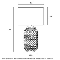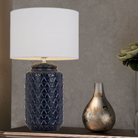 The perfect table lamp for accenting bedrooms, living areas, and entryways. The modern angular symmetrical pattern in the latest designer colours. Topped in a classic, white poly-cotton drum shade.