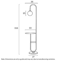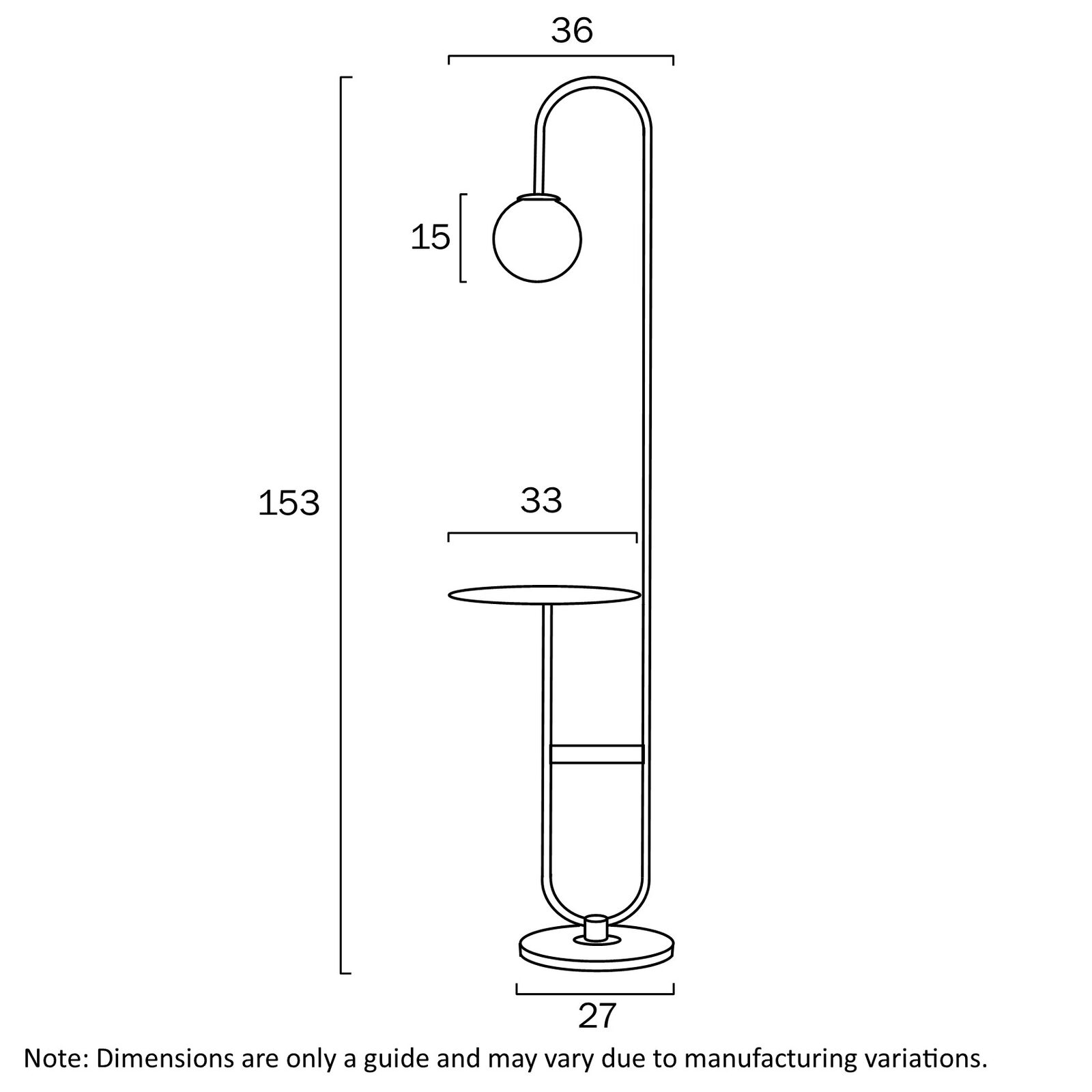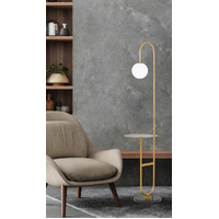 The Inez is the perfect Mid-Century Modern floor lamp offering stylish lighting for your living space. The sleek metal frame comes in an antique gold finish for an elegant look, with the top arm supporting a opal matt glass sphere. The lower arm supports a round tray table. The floor base is black marble.