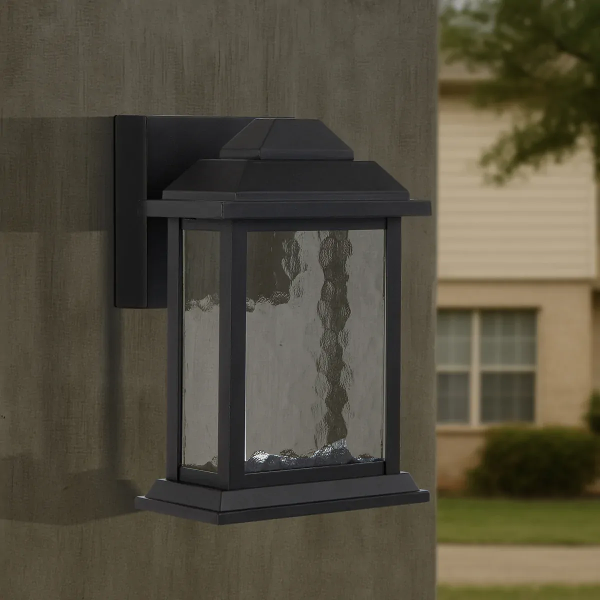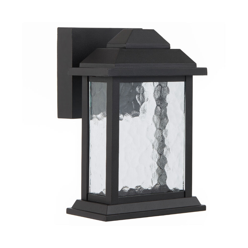 The Jovaro exterior wall light features a sleek black sand finish paired with beautifully textured water-glass panels that create a soft, inviting glow.