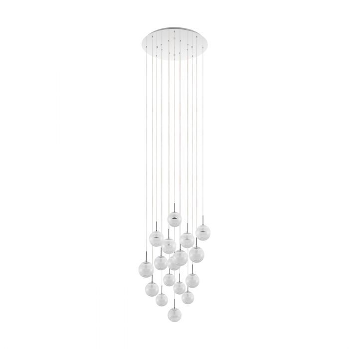 This pendant luminaire from the series MONTEFIO 2 is made of chrome-plated steel, frost & clear glass with feature crystals for a glistening effect.