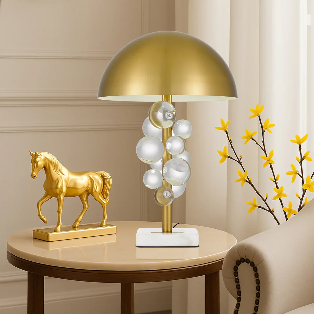 The Narvik Table Lamp has frosted spheres gracing the gold frame almost as if they are suspended in air. The graceful lamp is finished with a domed metal shade adding extra focus to the base which is finished in white marble. Modern and glamorous describe this polished and refined lamp's unique aesthetic. The Narvik lamp is home in a variety of spaces from a chic living room to a modern bedroom.