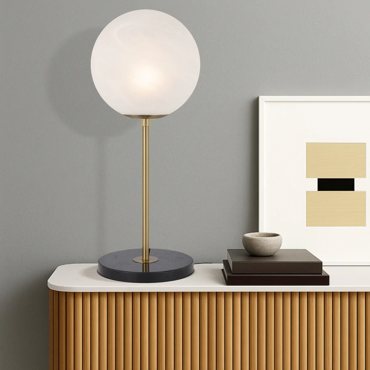 The Oliana table lamp is elegant and ultra simple in design, suitable for any contemporary interior space. The glass is mouth-blown alabstro and supported on top of hand polished antique gold metalware. A black marble base supports the complete structure.