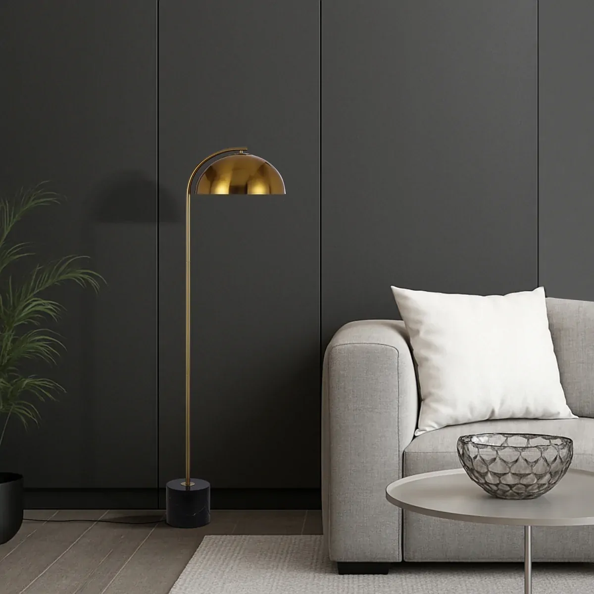 The Ortez Floor Lamp is the classic vintage look, supplying lighting to the smaller surfaces of your home. The domed metal shade sits on an arched arm and the marble base offers stability and style to your home's décor. On/off switch located on the lamp's cord.