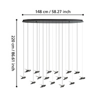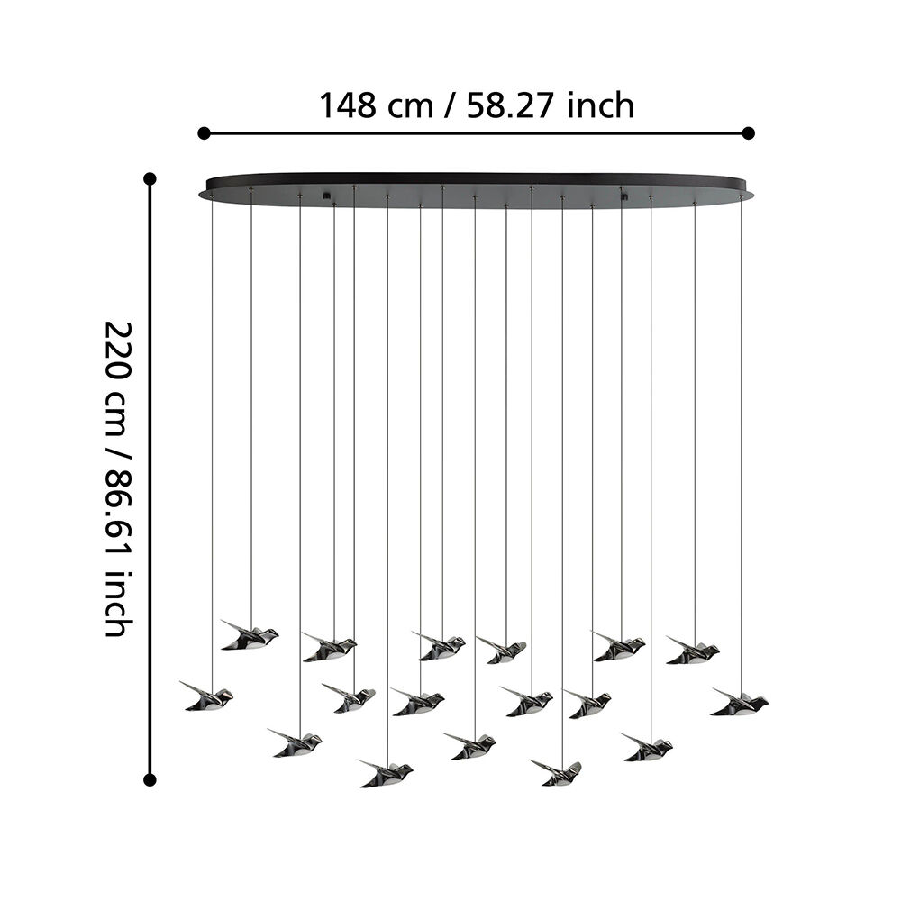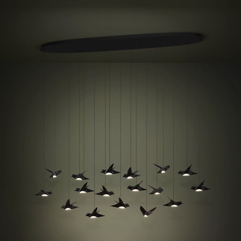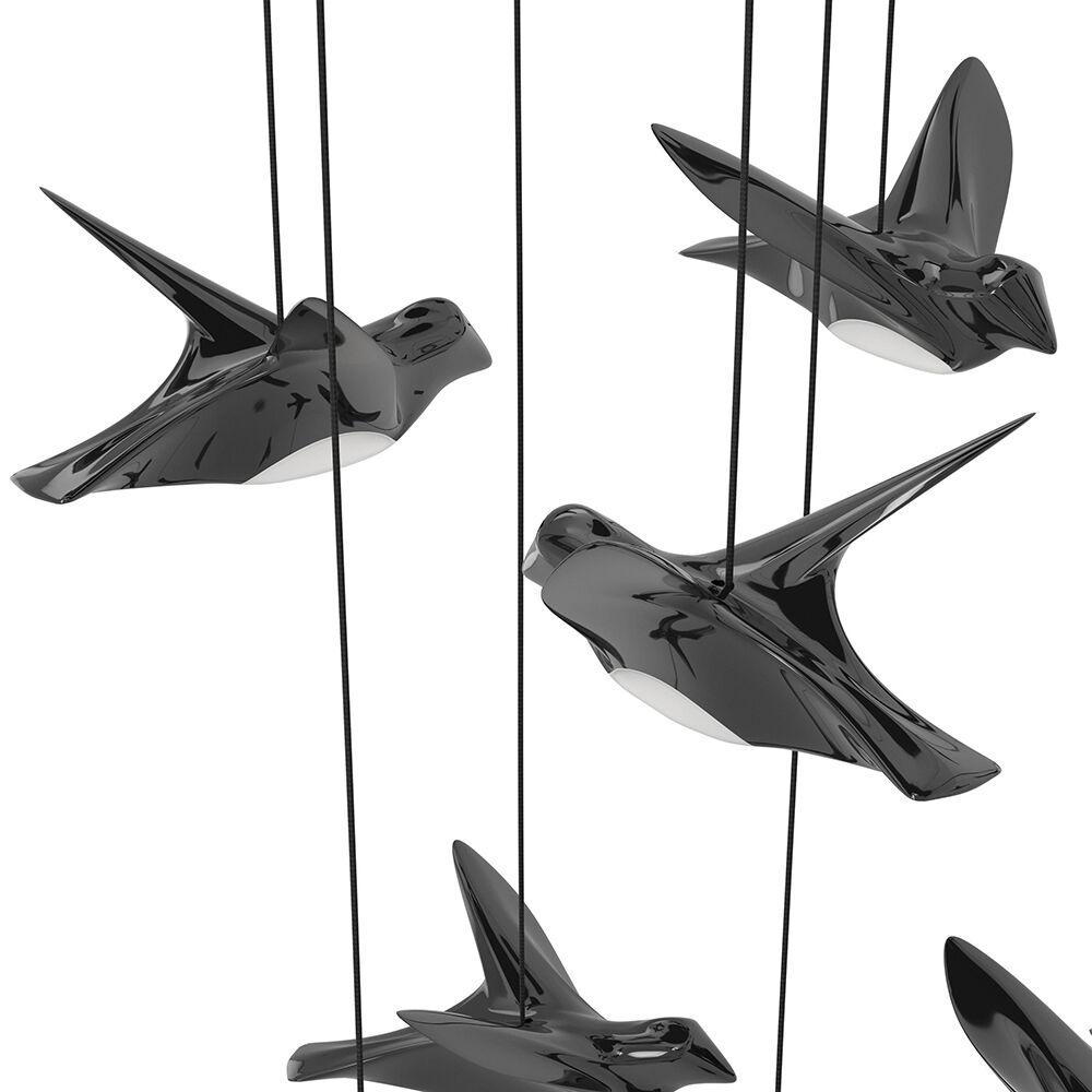 The PARATEBUENO LED pendant features nickel-nero steel and floating bird accents, casting a warm glow and airy feel. Available in sizes to suit any space.