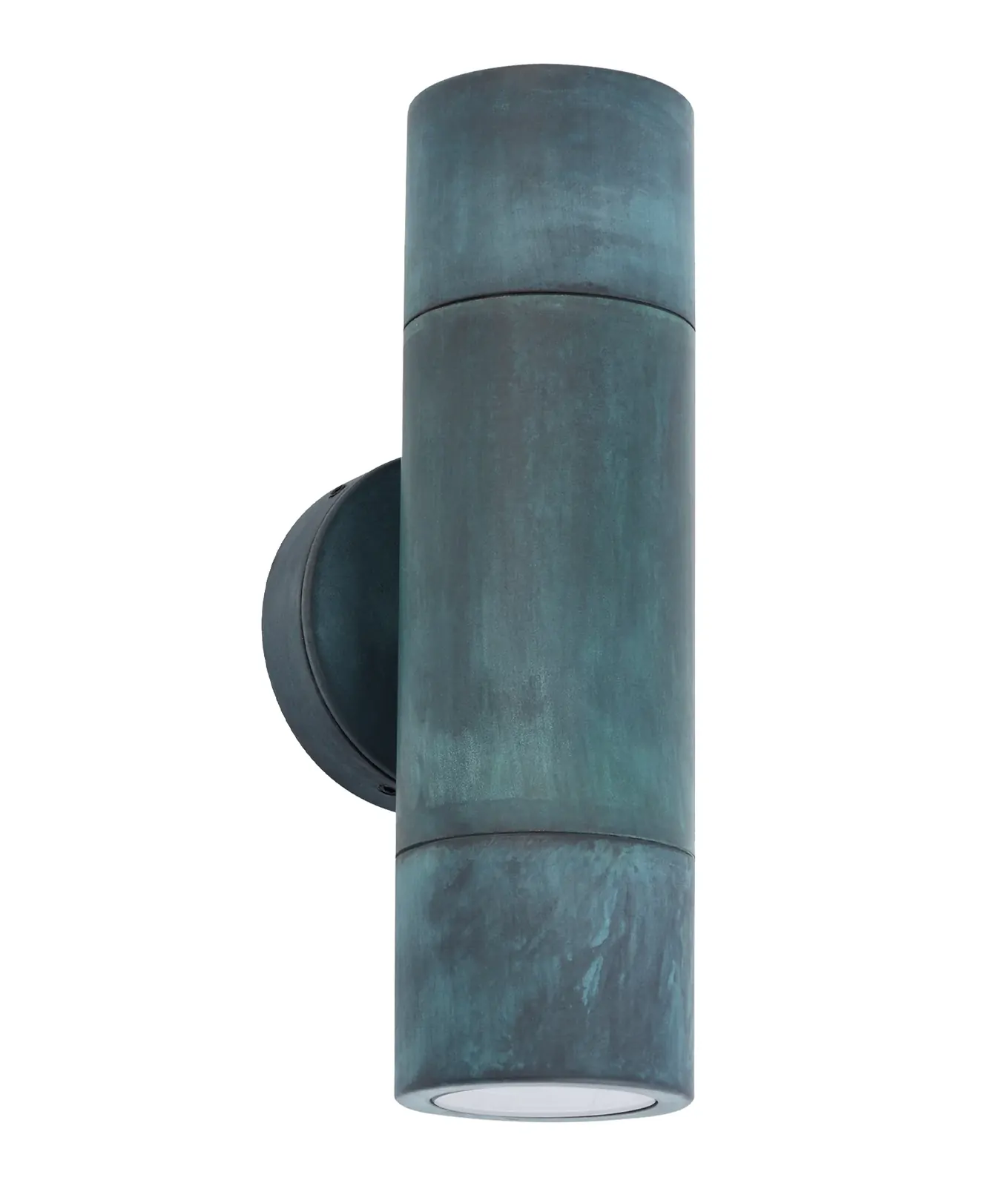 Description: WALL GU10 X 2 (Max 35W HAL) PILLAR UP/DN Green Patina Finish Solid Brass IP65 (no globes) WTY 2YR