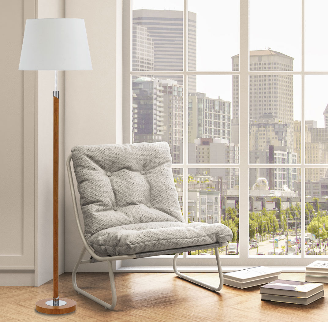 The Belmore is the classic go to contemporary lamp. The main focus is timber look finish in either teak or walnut that is accented with chrome trim. The fabric shade provides a warm and cosy atmosphere to every room. Available as table or floor lamp.
