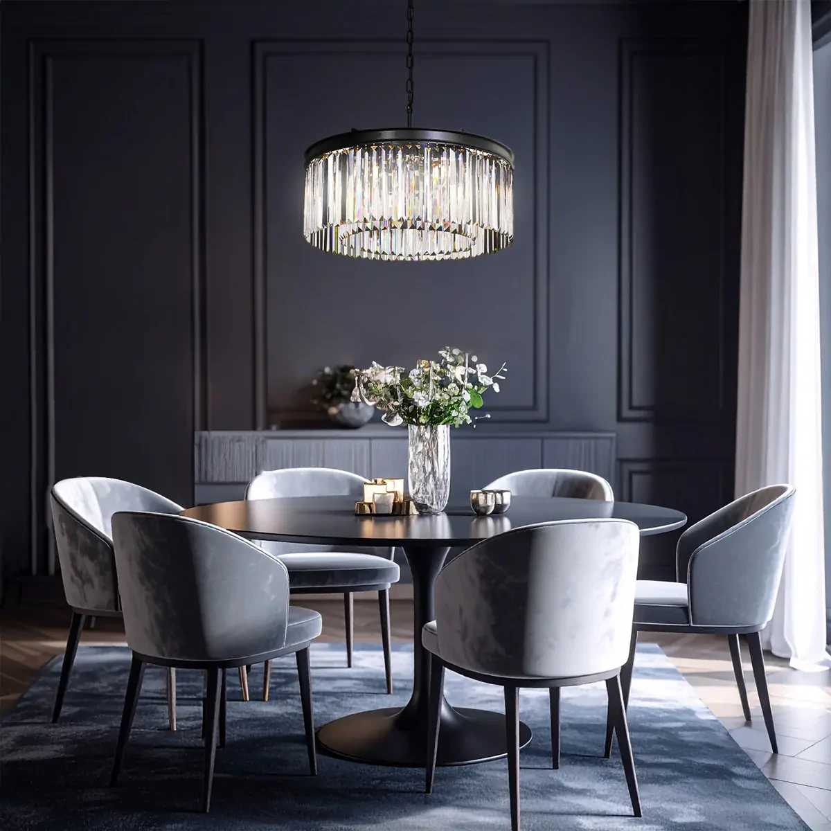 The Serene 6 pendant light offers a touch of glamour, drawing inspiration from classic Art Deco design, featuring a blackened bronze finished round structure with curtains of faceted crystal prisms subtly refract light, evoking the allure of the era. Other sizes are available within the Serene family.
