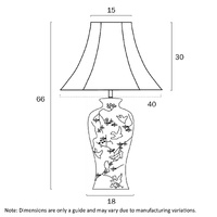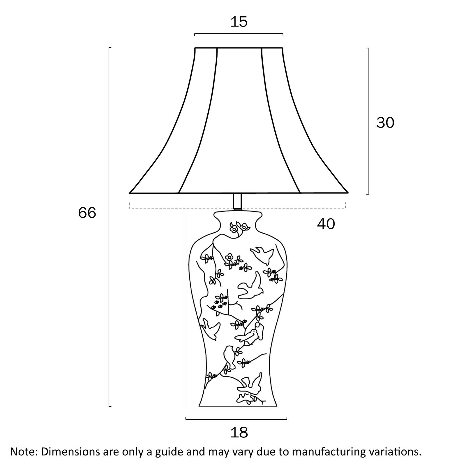 The Shibo table lamp is the height of classic elegance. The shapely temple jar is made of ceramic and is patterned with spring blossom and playful bird inspired charm. The motifs are hand applied and all have subtle variations. An off white supreme shade provides a balanced contrast to this unique lamp.