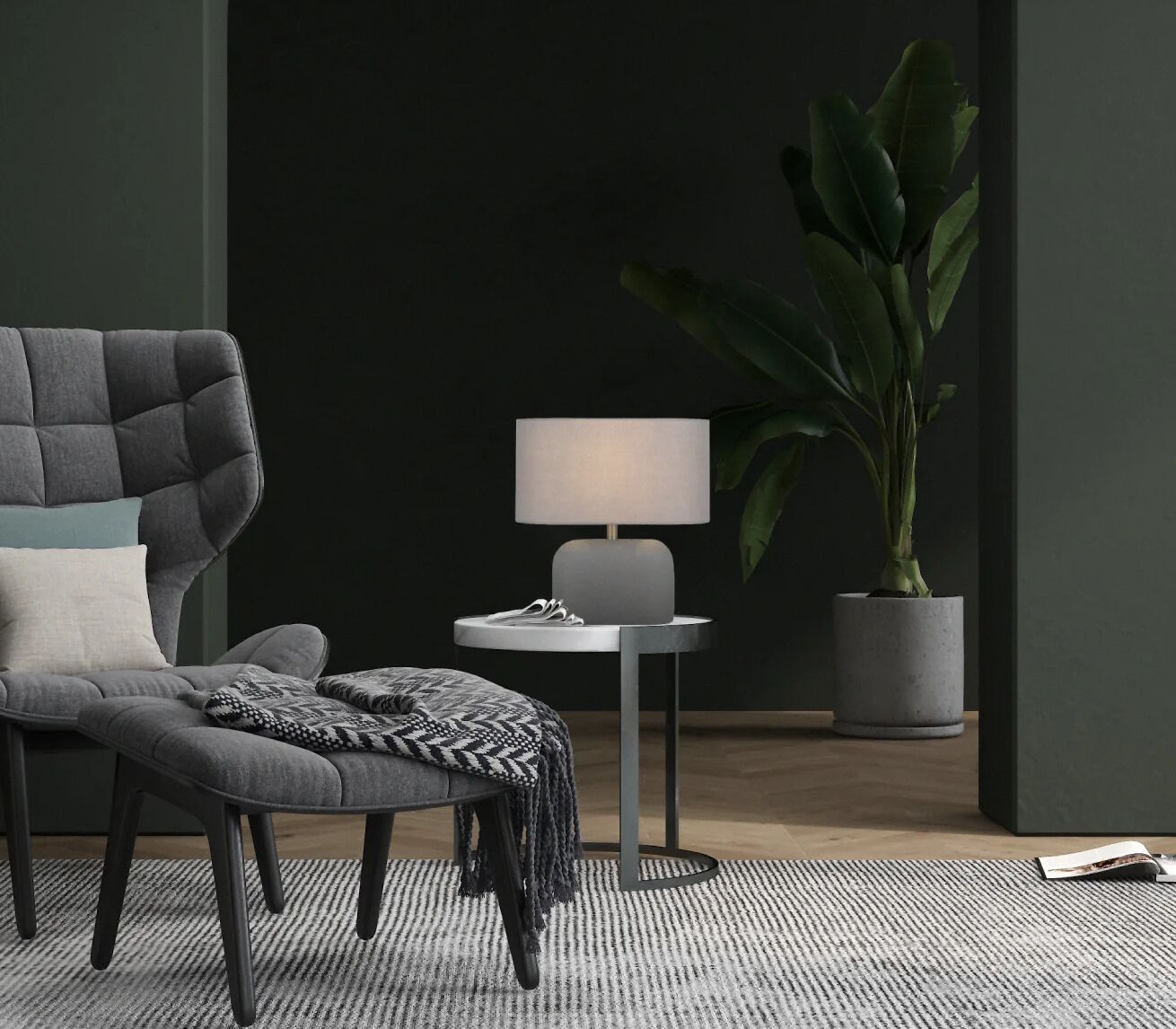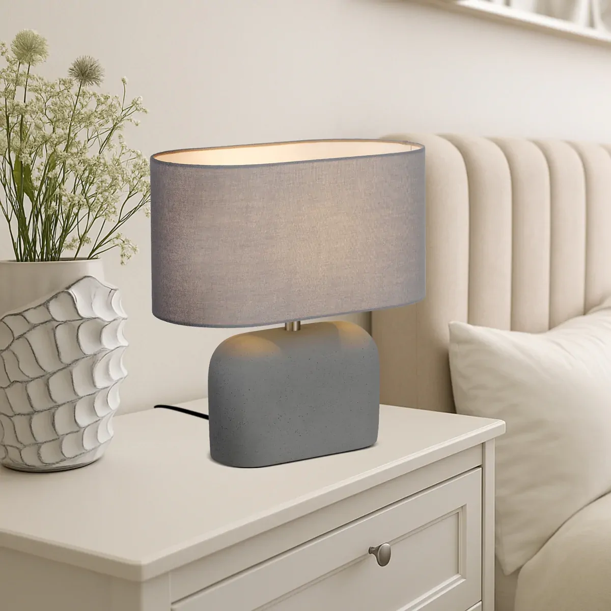 The Reano table lamp is a modern rectangular oval-shaped lamp. Its unique design adds a touch of elegance and sophistication to any room, while providing a soft warm glow to create a cozy ambiance. This lamp is perfect for use in a living room or bedroom. Available in 2 colours, a natural toned terrazzo base or a grey matt concrete finish with fabric shade.
