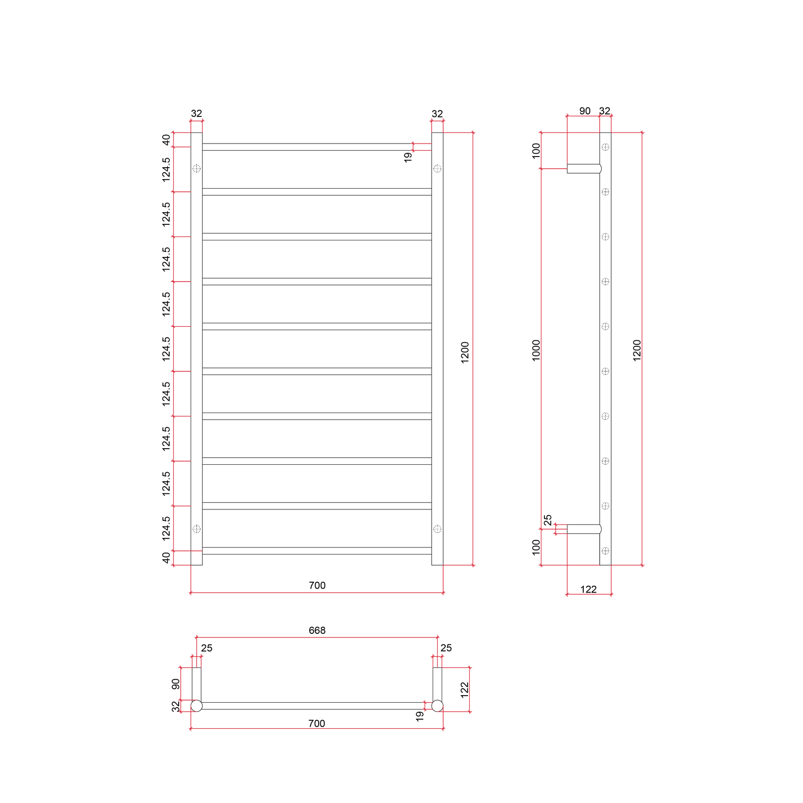Thermorail Straight/Round 700x1200x122mm 128Watts 10 Bars - Brushed Nickel