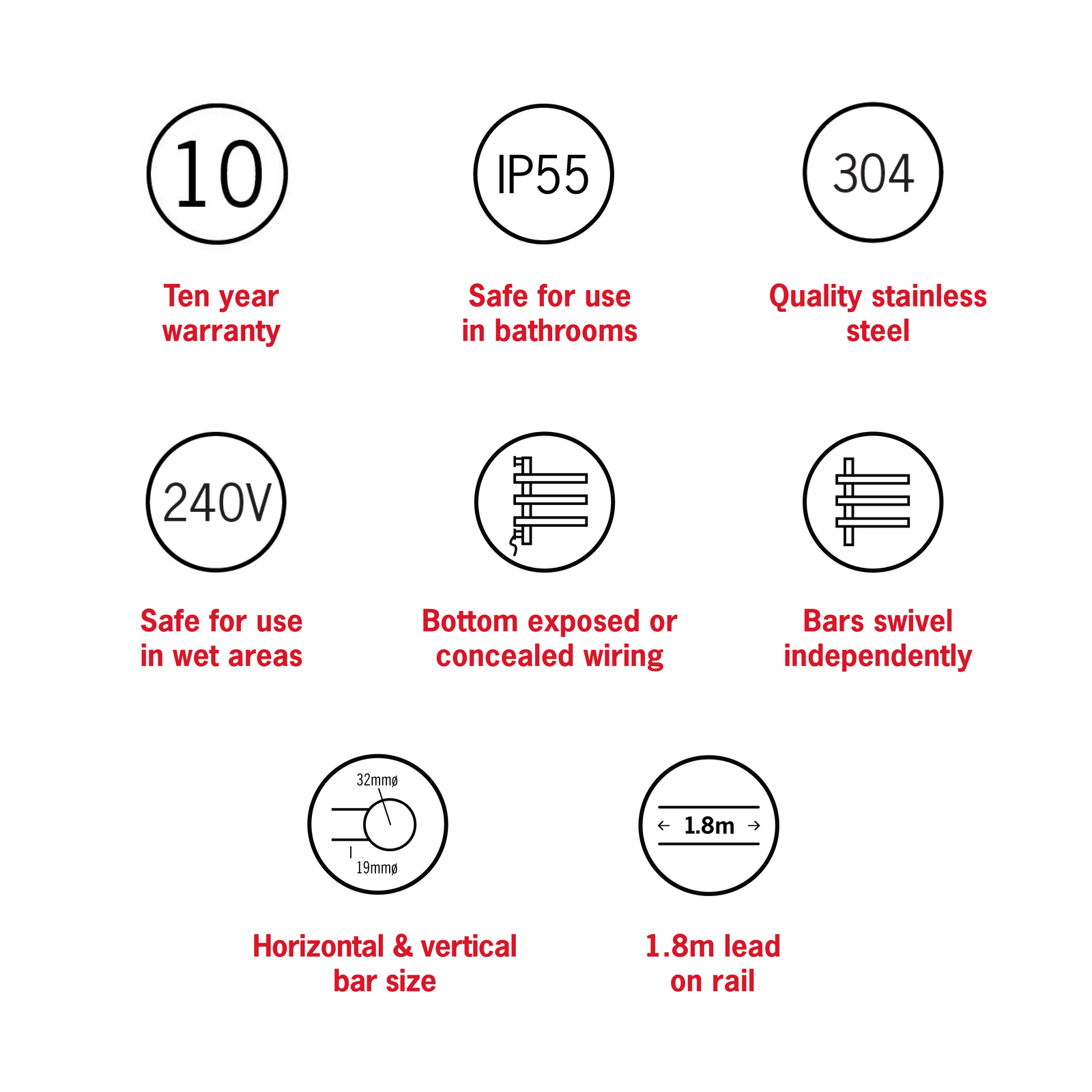 The electric towel rail is designed to rapidly heat up and reach a temperature of around 45-55 degrees. We recommend using a timer to allow you to set and forget and control your running costs. As the rail is electric it is very energy efficient and can cost as little as a $1 a week to run.