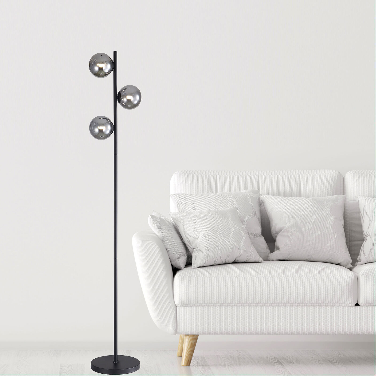 The VALCROSS decorative floor lamp, black metalware with smoke glass spheres. The iconic sphere design creates an accent piece which looks great in both mid-century modern and contemporary living spaces. Complete with low wattage LED bulbs, the diffused light creates a soft, ambient glow that’s perfect for reading nooks and relaxed living rooms