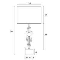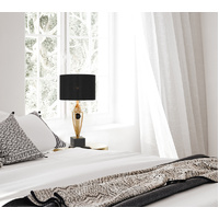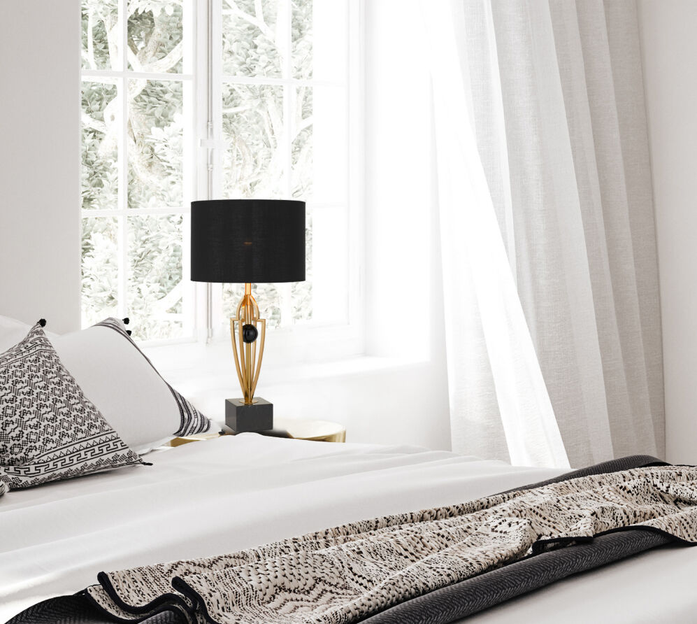 The Vardo table lamp brings beauty to your modern living room space. Featuring a black shade, antique gold body, all resting on a black marble cube.