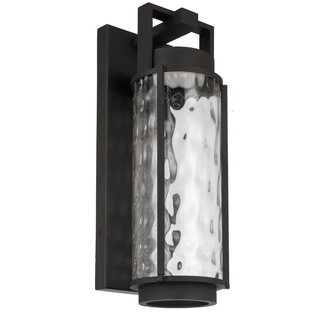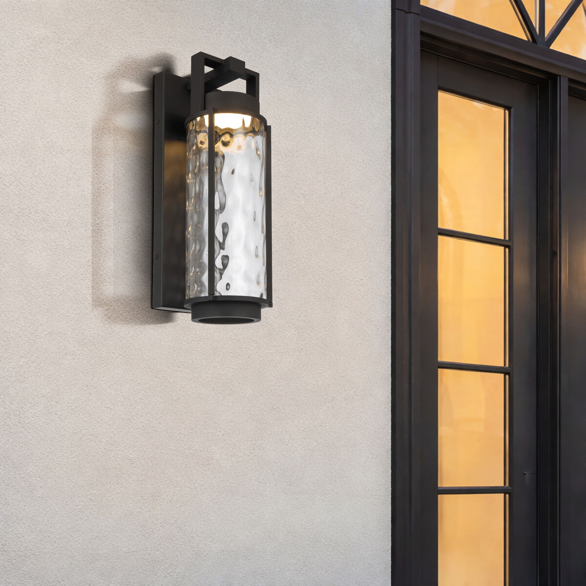 The Vexor outdoor wall light pairs a clean aluminium frame with water-textured glass to create a soft, inviting glow.