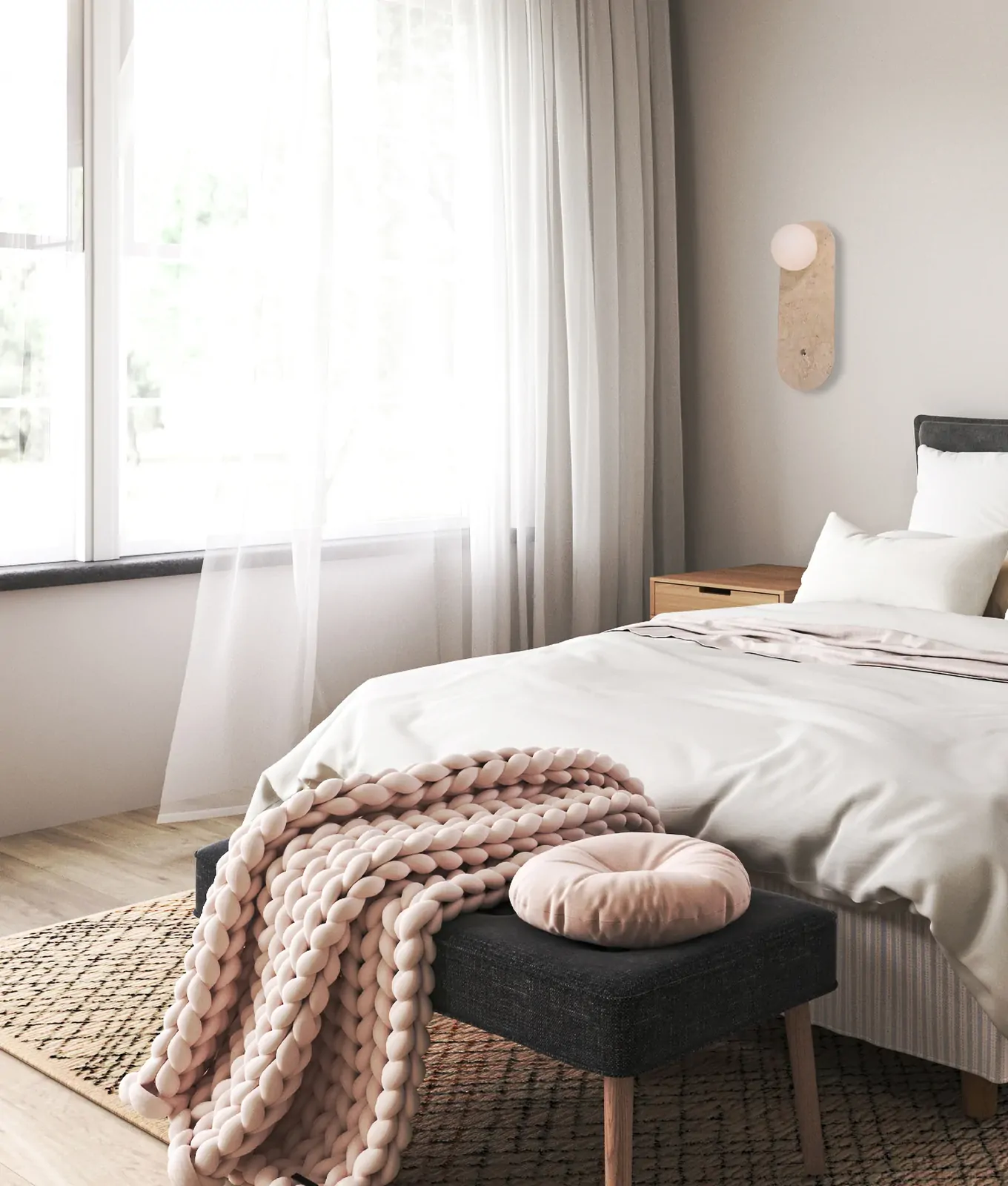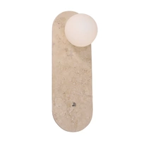 POI: Interior Oblong Travertine Base with Beige Finish & Round Opal Diffuser Wall Light