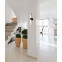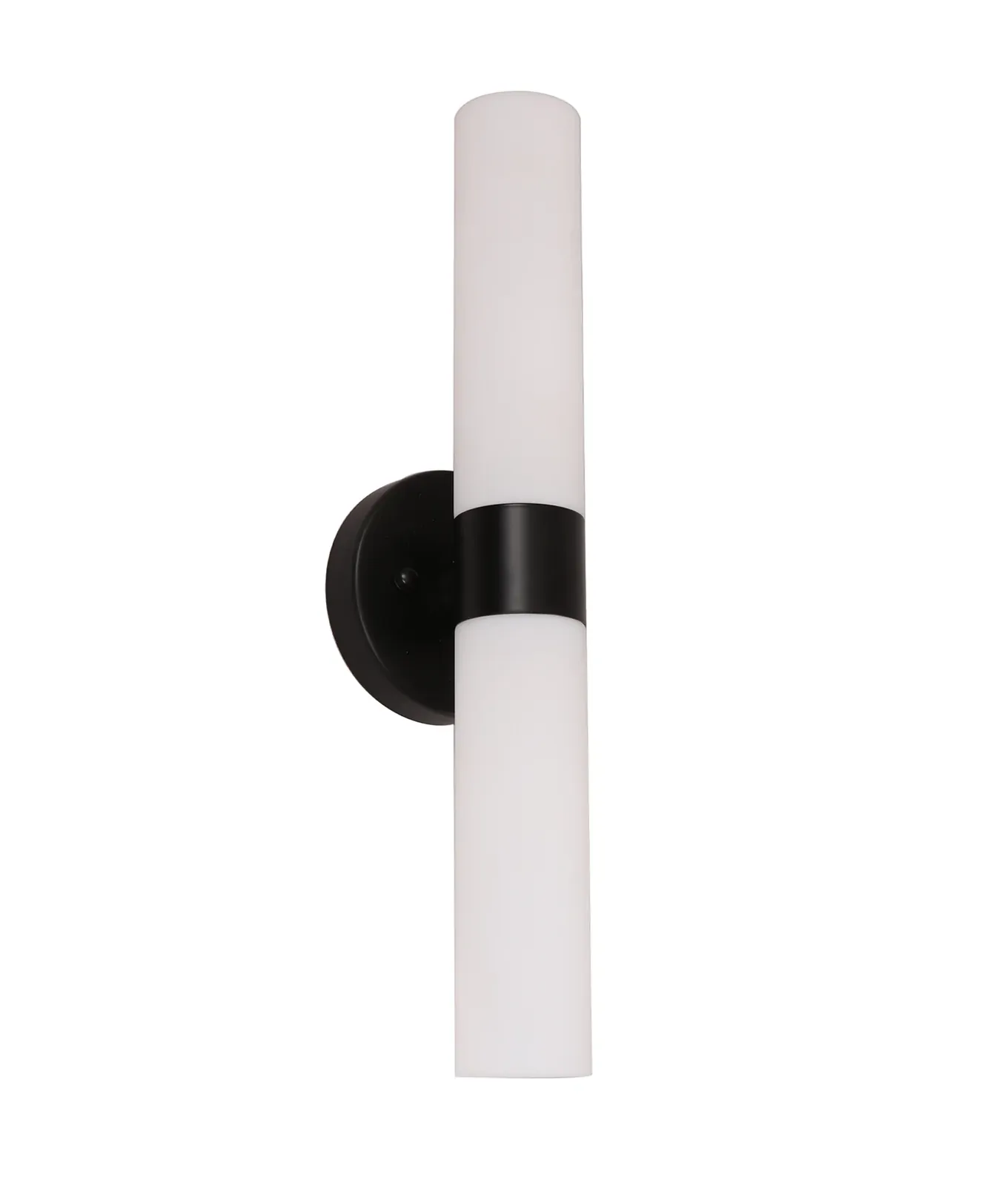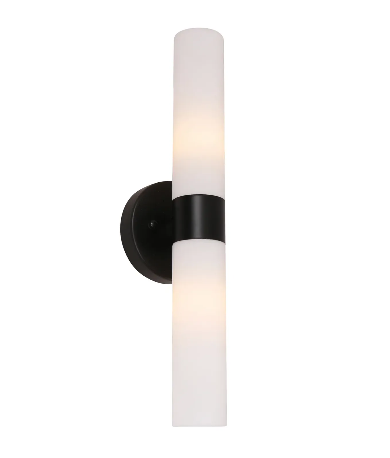 Description: WALL 2 x ES 40W INTERNAL S/M Up/Dn TUBULAR Opal Glass w/Black Highlight & RND Base Open Top & Bottom IP20 WTY 1YR