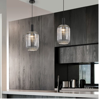 Elevate your space with the Telbix Bonura 14 Pendant, a compact and elegant lighting solution showcasing a ribbed-glass cylinder on a minimalist metal frame.