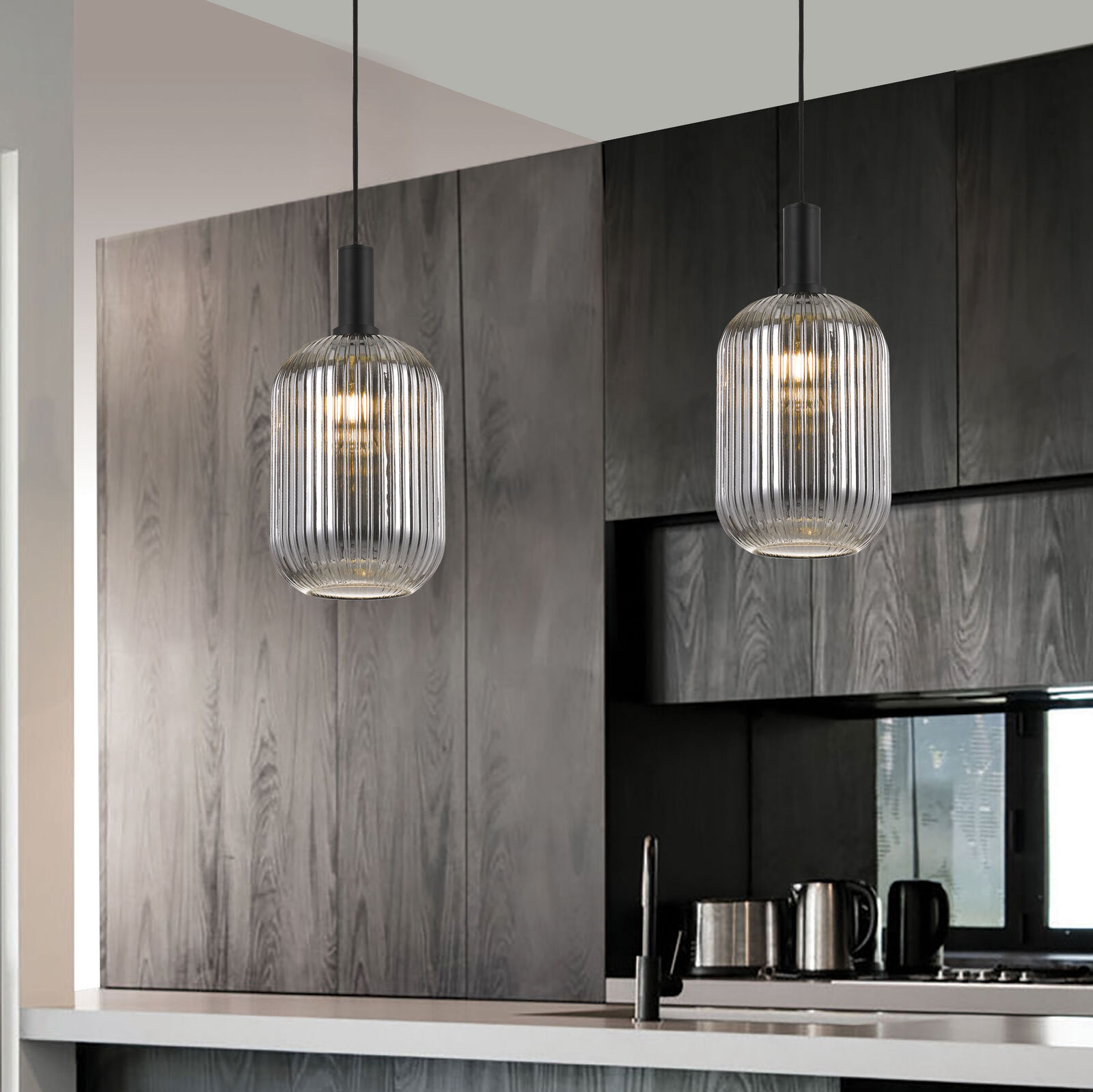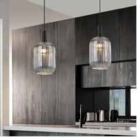 The Bonura 20 Pendant by Telbix is a sleek and timeless lighting piece featuring a ribbed glass shade and refined barrel shape. Available in black with smoke glass or nickel with clear glass, it suits a range of contemporary interiors. With an adjustable 200cm fabric cord and compact 20cm diameter, it's perfect for bedsides, kitchen islands, or clustered installations. Compatible with E27 globes and dimmable when used with the right setup, the Bonura 20 combines style and functionality in a versatile, elegant form.