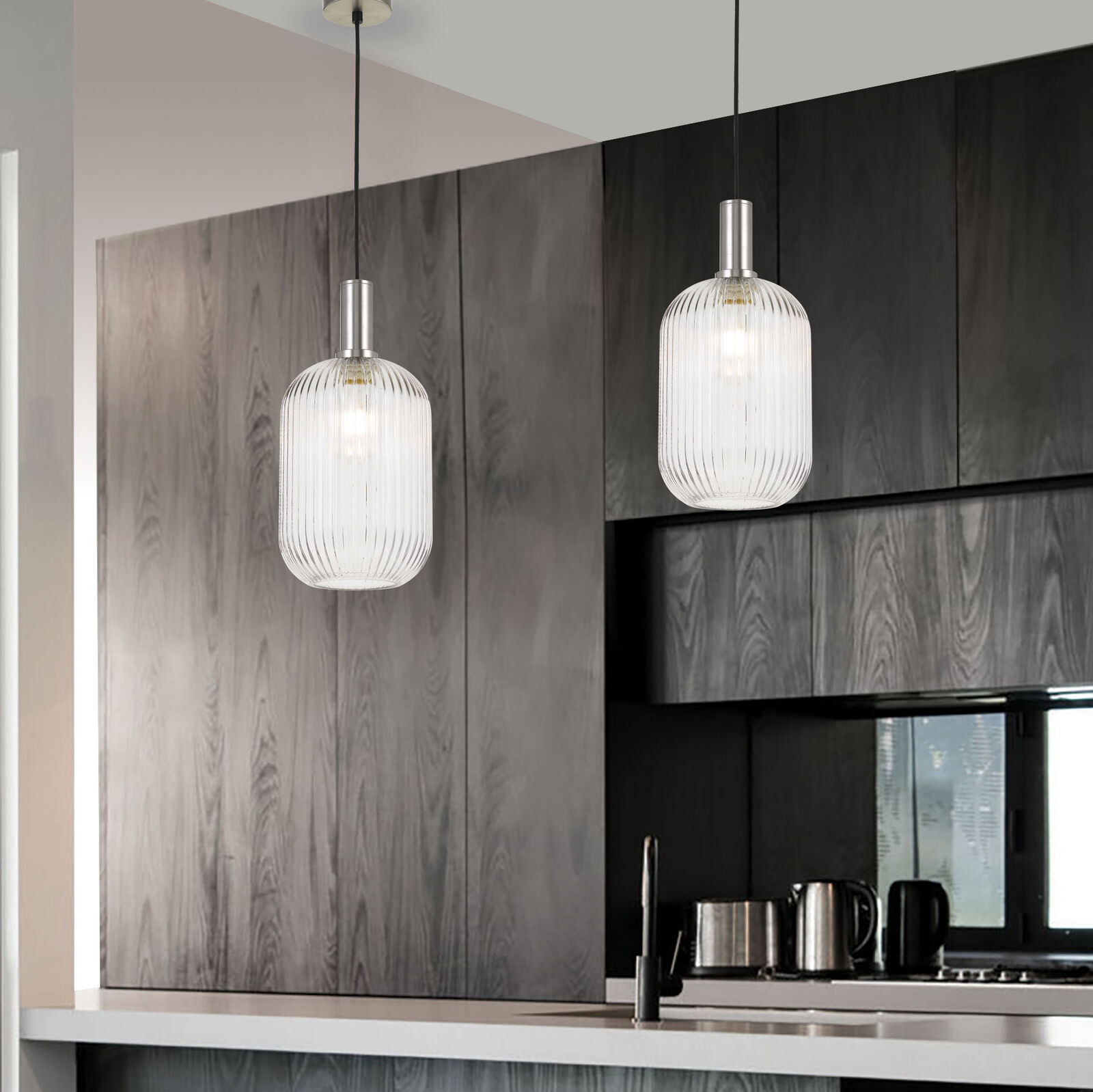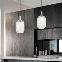 The Bonura 20 Pendant by Telbix is a sleek and timeless lighting piece featuring a ribbed glass shade and refined barrel shape. Available in black with smoke glass or nickel with clear glass, it suits a range of contemporary interiors. With an adjustable 200cm fabric cord and compact 20cm diameter, it's perfect for bedsides, kitchen islands, or clustered installations. Compatible with E27 globes and dimmable when used with the right setup, the Bonura 20 combines style and functionality in a versatile, elegant form.