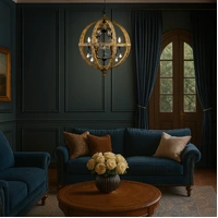 The eye-catching Florin pendant is a french crystal teardrop chandelier framed by a classic wooden open cage orb.