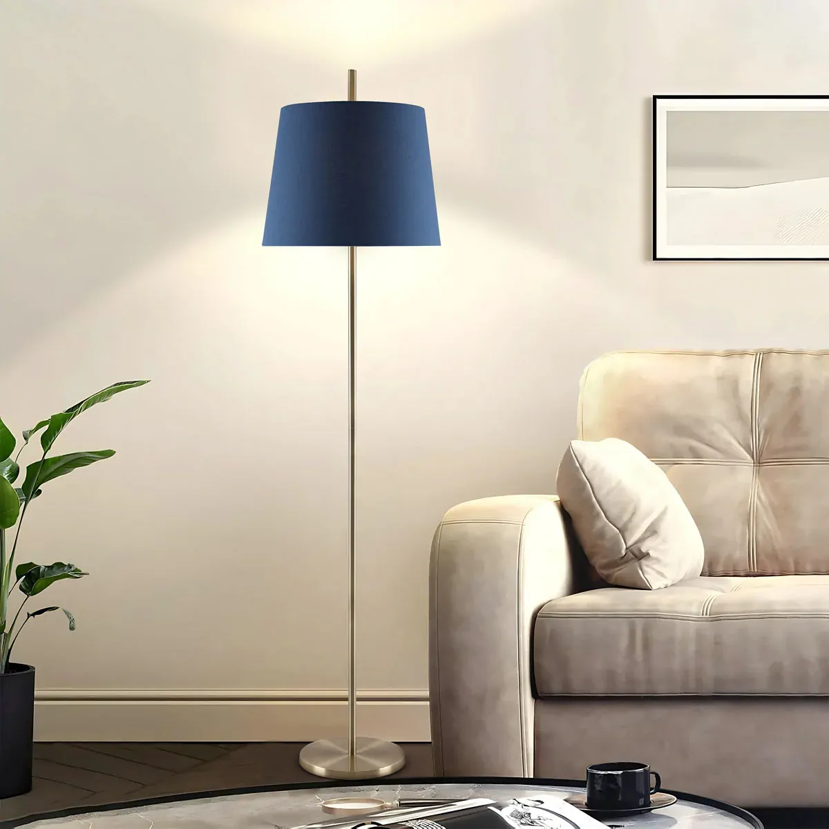 An opulent look by its finish, yet elegant and simple, the Dior floor lamp features an antique brass finished circular base and column stand topped with a textile shade in blue or white