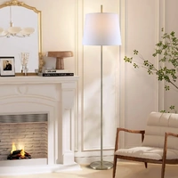 An opulent look by its finish, yet elegant and simple, the Dior floor lamp features an antique brass finished circular base and column stand topped with a textile shade in blue or white
