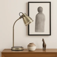 The Nova desk lamp amalgamates the finest elements of contemporary design. Spun metal shade to house a standard A60 globe attached by a saddle deco and a half flexi arm for adjustment. On/off rocker switch located on the lamp base. Also available as floor lamp.
