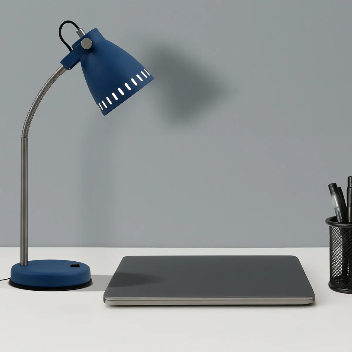 The Nova desk lamp amalgamates the finest elements of contemporary design. Spun metal shade to house a standard A60 globe attached by a saddle deco and a half flexi arm for adjustment. On/off rocker switch located on the lamp base. Also available as floor lamp.