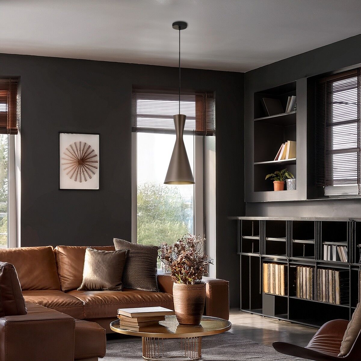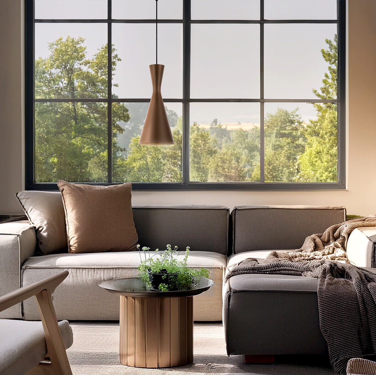 The FLERO single suspended geometric shade, crafted from aluminium, offers direct downward illumination.