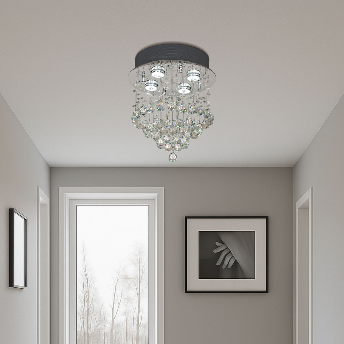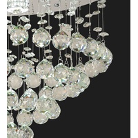 The SAVINA Round crystal collection makes a spectacular statement with lavish crystals and glowing LED light. Dramatic baskets and leaf waterfalls of hand-polished crystal spheres with sparkling beads suspend from the ceiling, shimmering light through each strand. The fixture is pre-trimmed with the crystal strands of fixed lengths, mounted to a precision-cut stainless steel ceiling plate.