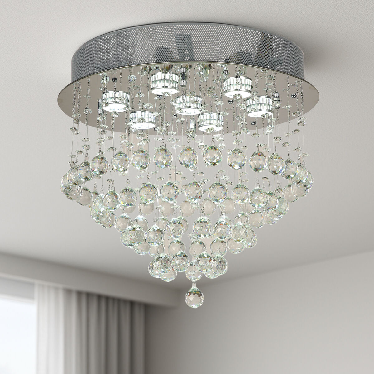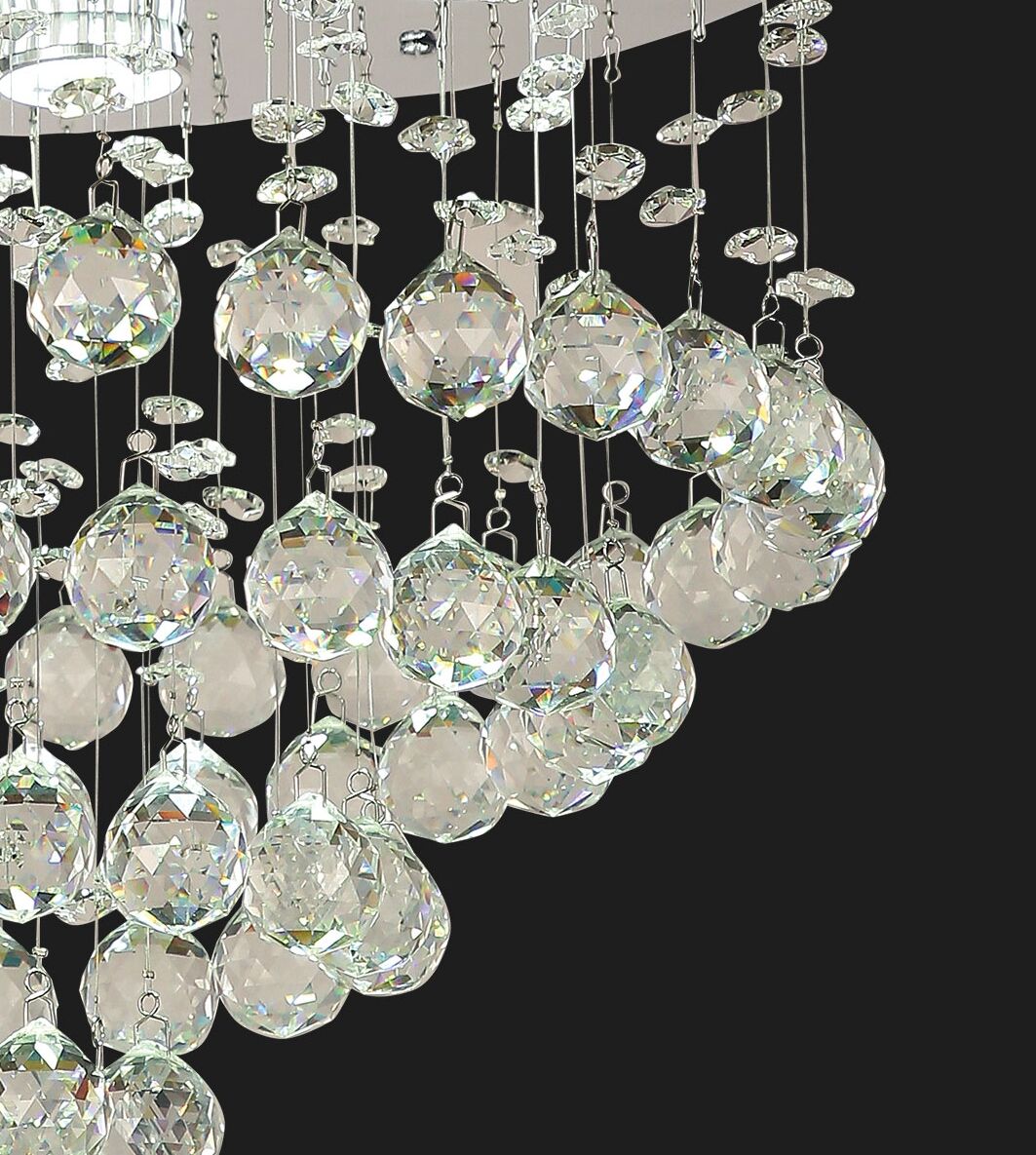 The SAVINA Round crystal collection makes a spectacular statement with lavish crystals and glowing LED light. Dramatic baskets and leaf waterfalls of hand-polished crystal spheres with sparkling beads suspend from the ceiling, shimmering light through each strand. The fixture is pre-trimmed with the crystal strands of fixed lengths, mounted to a precision-cut stainless steel ceiling plate.