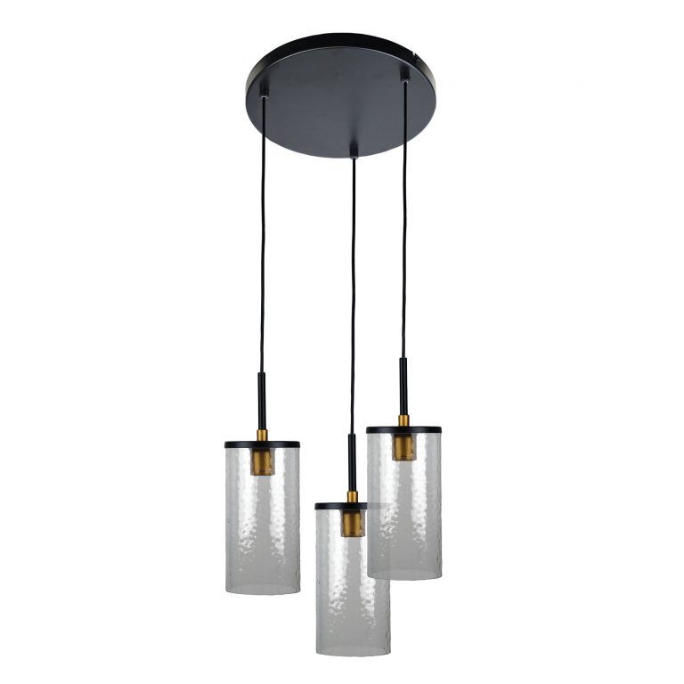 The Raymont features black metalware with aged brass highlights. The obscure glass, with water weave pattern, gives the Raymont that something special. Ideally paired with an LED filament bulb. The 3 cords can be shortened at installation.