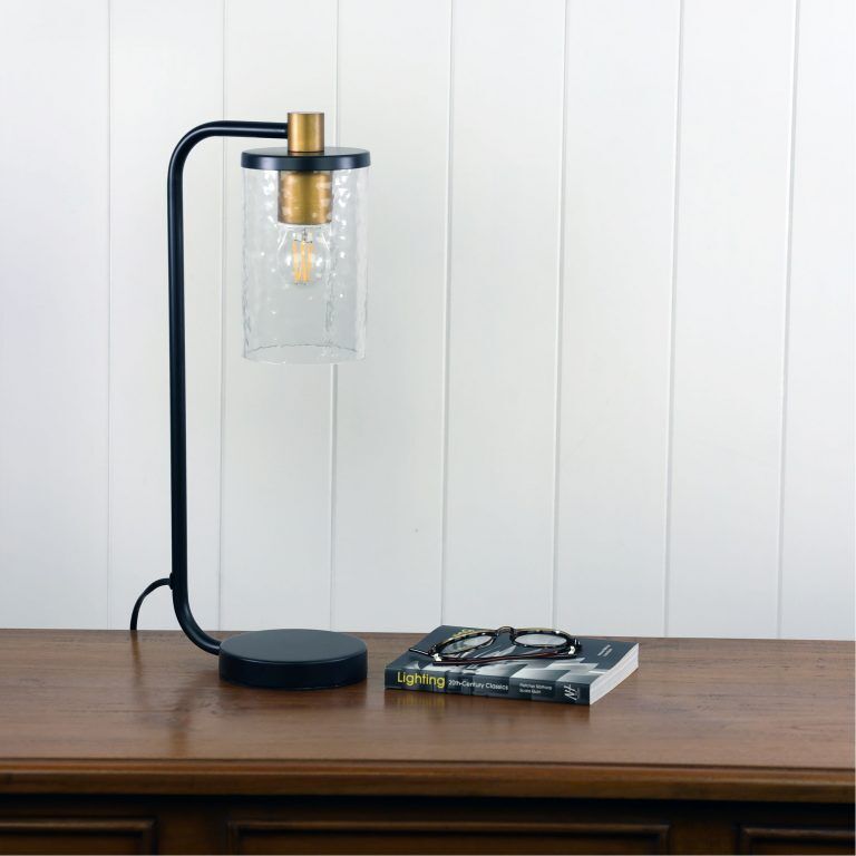 The Raymont features black metalware with aged brass highlights. The obscure glass, with water weave pattern, gives the Raymont that something special. Ideally paired with an LED filament bulb. An excellent bedside lamp.