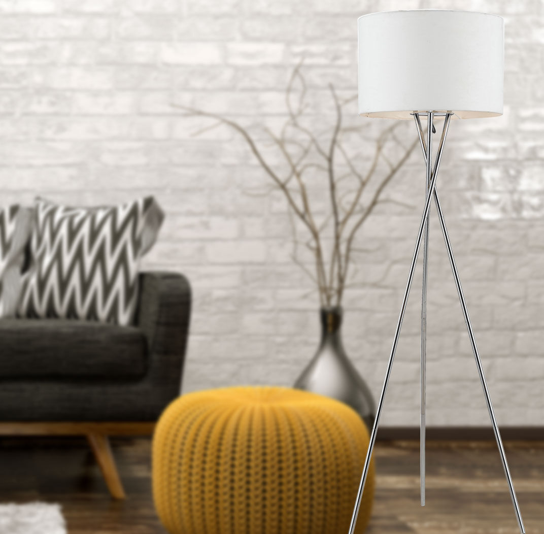 The Denise floor lamp is a contemporary classic. A large fabric drum shade sits atop of sleek, crossed tripod legs. Available in 5 colours.