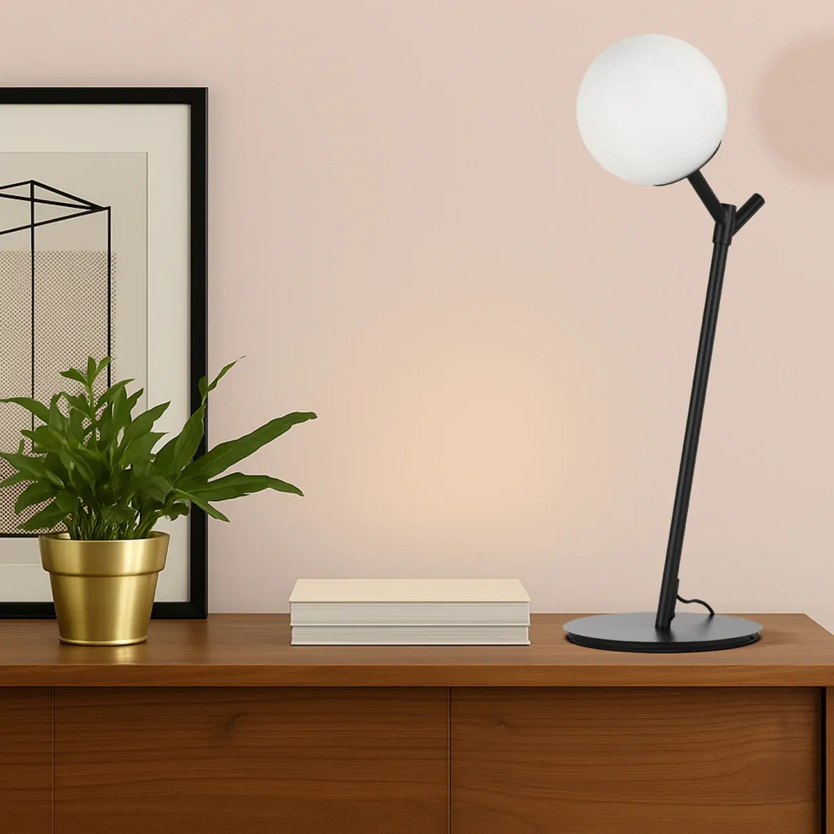 The versatile Ohh table lamp adds that Scandi design to any room of your home. The diagonal arm supports a mouth blown opal matt glass globe. Also available as floor lamp.