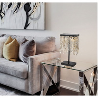 Sparkling cuts of optik crystal make the Cerone table lamp a modern classic. The rectangular design provides a shallow footprint giving you more space on your table. When lit the room takes on a classic and luxurious shimmer. Available in Antique gold with clear, Black with champagne or Chrome with smoke.