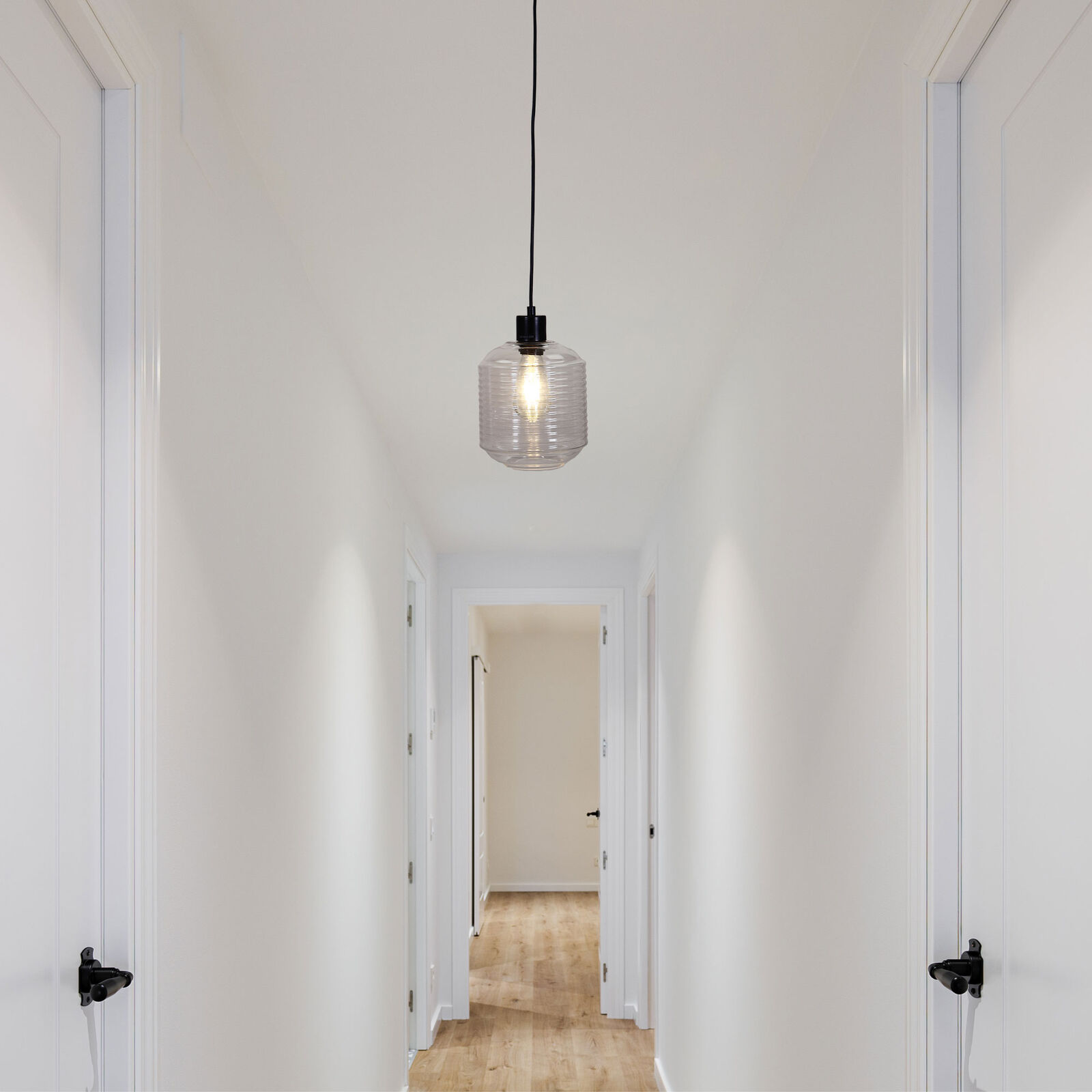 The Marconi Pendants rustic design pairs perfectly with natural materials. The simple styling of the black metalware contrasts well with the decorative clear glass shade. The opening in the bottom of the shade allows for easy bulb access. Suspension length can be reduced by the installing electrician.